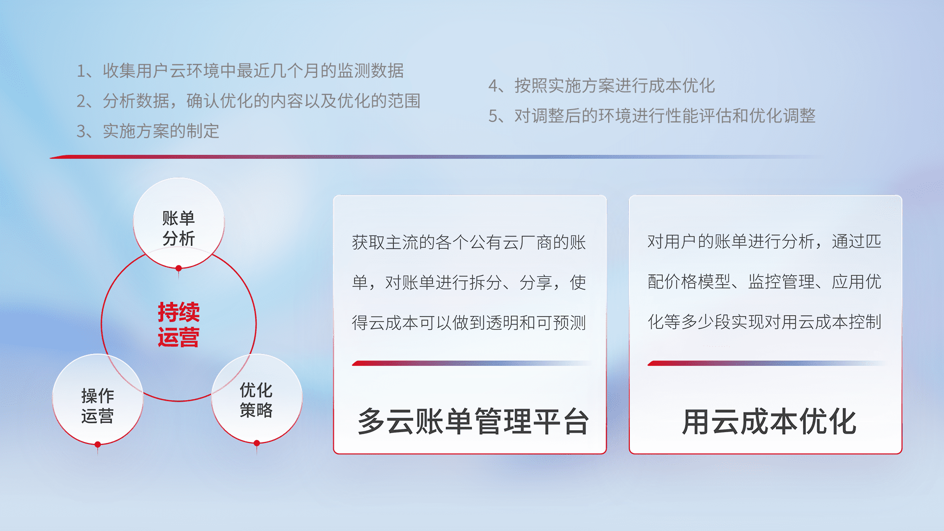 通过多云纳管,,以统一的资源数据模型把客户的云资源进行抽象和封装,,,,进而实现对多云资源的统一操作,,,保障云资源管理的可靠性、、稳定性与可用性。。量身定制化运维内容,,,,配置、、开发运维、、、补丁管理、、备份、、监控、、、认证和访问管理、、、、审计和日常巡检等,,,保障在用云过程中的可靠度,,,稳定度以及高可用率。。。